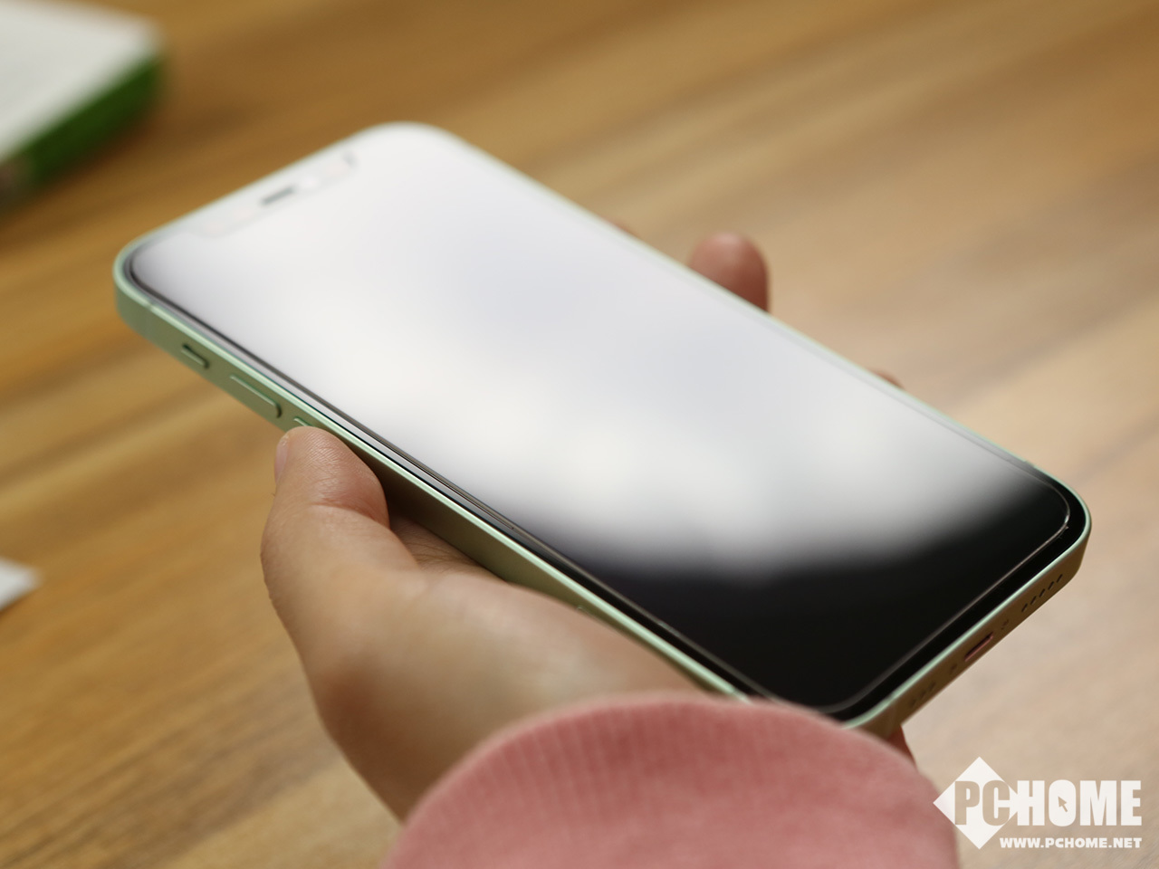 贴好以后的实拍效果,可以看到在顶部刘海部分,贝尔金UltraGlass抗菌屏幕保护膜预留了开孔,上下及两侧都有与边框有一定距离,并不是完整覆盖整个iPhone 12玻璃盖板的。