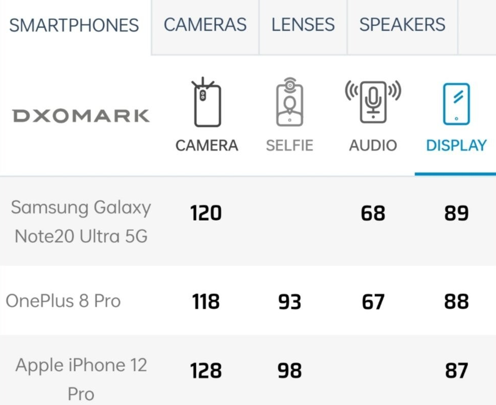 最近,知名测评机构DxOMark公布一篇最新智能手机屏幕得分排行榜。其中三星Note20 Ultra 5G排在第一,一加8 Pro第二,苹果iPhone12 Pro排在第三。