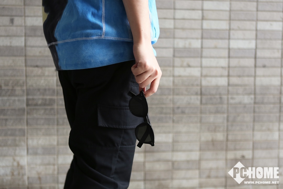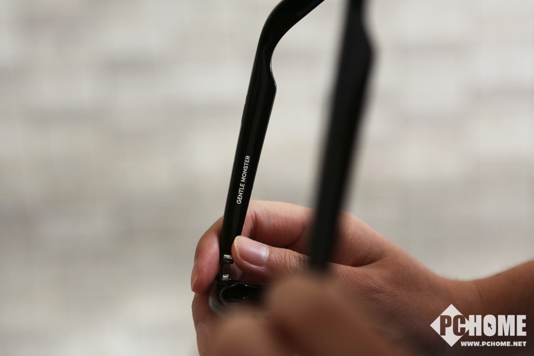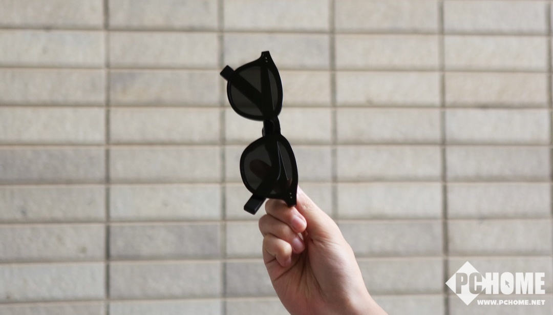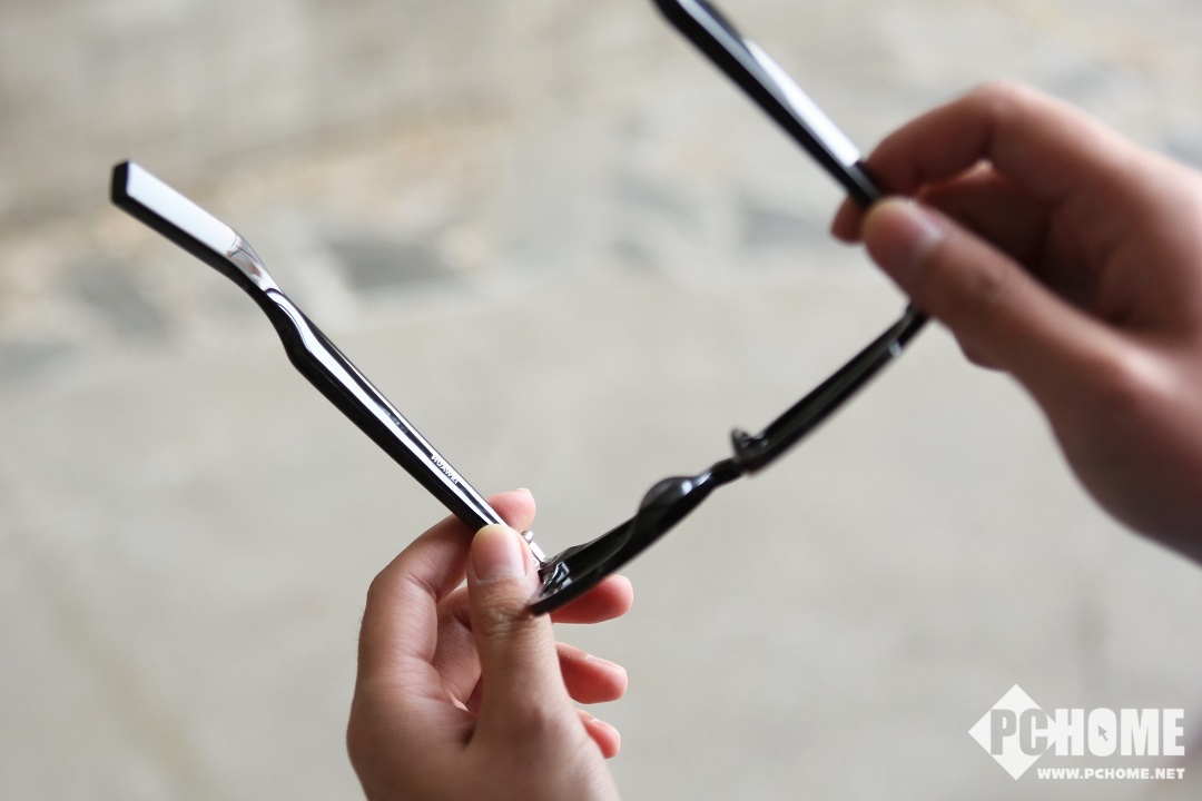 SMART LANG的镜框形状采用了圆形的设计,大小相当于半个手掌,佩戴时可以符合大多数人的脸型。由于镜腿中含有器件,所以相比于一般的太阳镜会显得有一些宽,但是是在可以接受的范围内,而且由于采用了极致的器件堆叠技术,更好的控制了镜腿的厚度与重量,也使得镜腿本体没有任何按键与接口,呈现了一体化视觉效果。