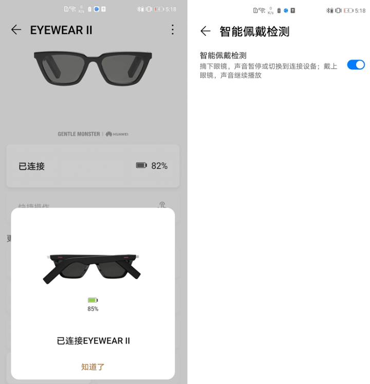 Eyewear II在连接方面也更加智慧,在笔者长时间没有佩戴眼镜后,再次佩戴时,就会在手机上看到弹出来的连接窗口,可以直接进入设置页面。并且在华为智慧生活APP中,我们可以开启智能佩戴检测,摘下眼镜,声音暂停或者切换到连接设备;戴上眼镜,声音会继续播放(要在3分钟之内)。