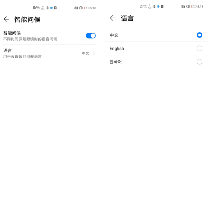 Eyewear II还拥有一个很人性化的功能就是智能问候(可在智慧生活APP中开启),用户在早中晚不同的时间段戴上眼镜可以听到不同的问候。另外,我们也可以设置语言,可以选择中文、英文或者是韩语。当用户找不到自己的眼镜时,也可以在智慧生活APP中使用“查找眼镜”功能,这样眼镜就可以发出声音,让大家更快速的找准眼镜的位置,不浪费时间。