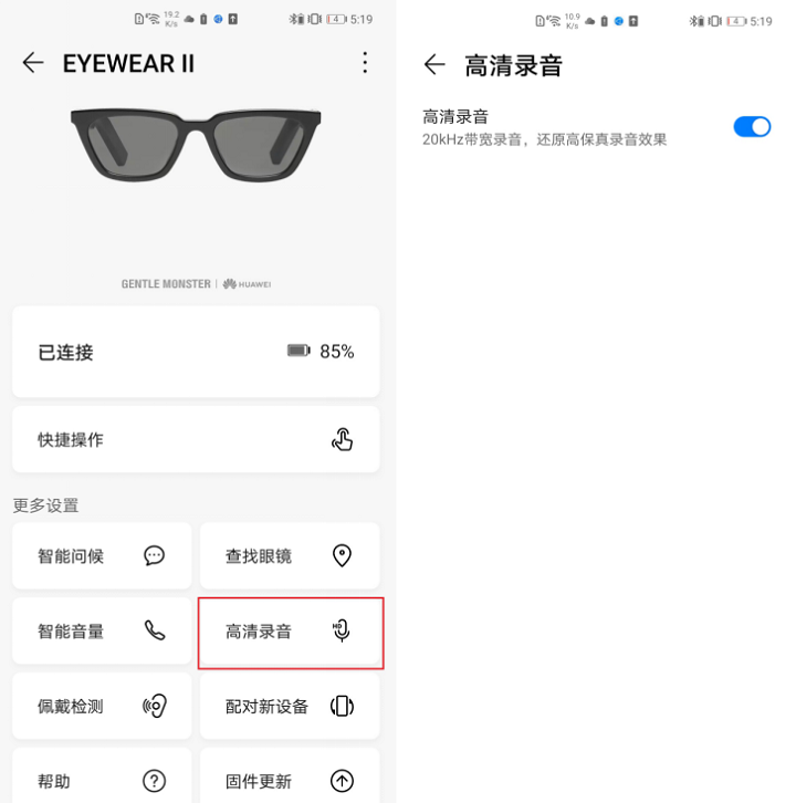 用户还可以使用Eyewear II进行高清录音,Eyewear II支持无损收录20Hz到20kHz频段的声音,该功能仅支持部分华为智能手机。