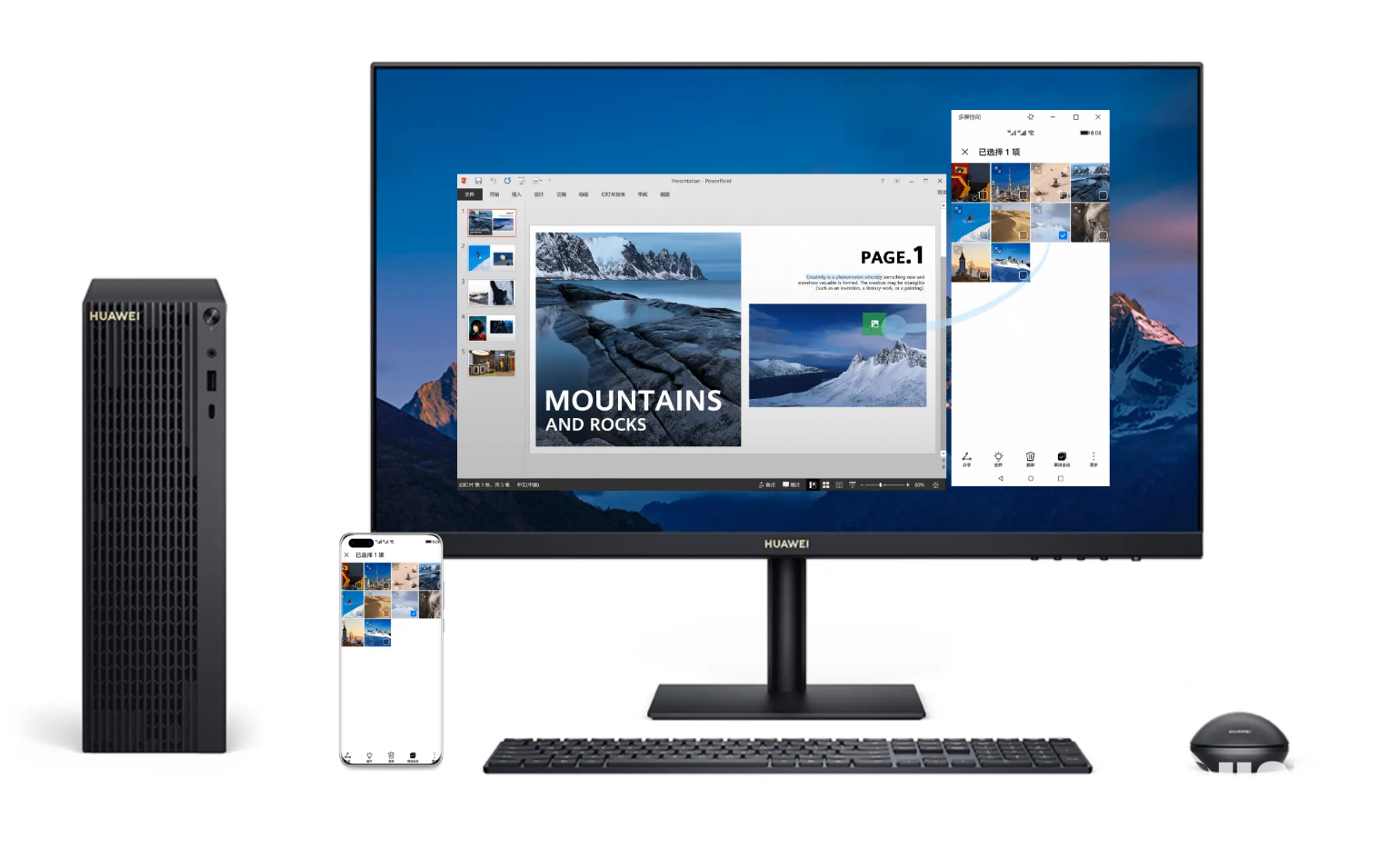 MateStation B515还支持华为独家的多屏协同功能,配套键盘内置了NFC,支持手机电脑一碰即连。手机贴到Shift区域,即可把手机屏幕镜像到显示器上,支持双向拖拽,文件互传。