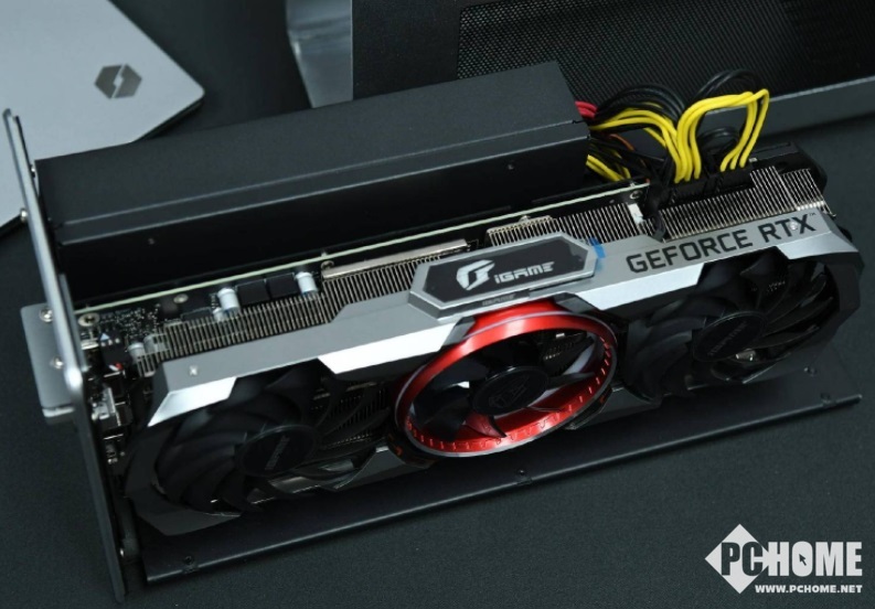 去掉显卡坞螺丝后可以将内部的钢架拉出,一共有两个 6+2Pin 的显卡电源接口。Flex 电源来自链力,额定功率 400W,其中 12V 最大输出达到 396W。官方用这款显卡坞测试了 RTX 3070 显卡,官方称用显卡坞后的 RTX 3070,在 3DMARK Fire Strike 和 Time Spy 中性能分别达到了台式机平台的 69% 和 74%。