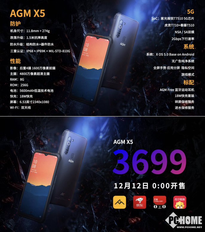 AGM X5将在12月12日与AMG官网、京东、天猫等电商平台全渠道开售,该机售价3699元,对于有户外使用需要的用户来说,是一款十分实用的5G专业手机。