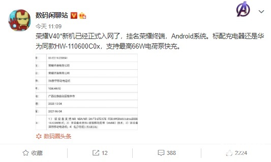 今天,@数码闲聊站爆料称,荣耀V40现已正式入网,搭载安卓系统,标配的充电器还是华为HW-110600C0x,支持最高66W电荷泵快充。