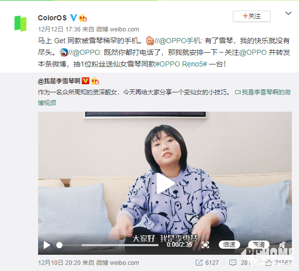 最近李雪琴在微博上公布了一段OPPO Reno5 Pro的上手视频,并表示给大家分享一个变仙女的小技巧。OPPO Reno5系列将于12月18日发售。