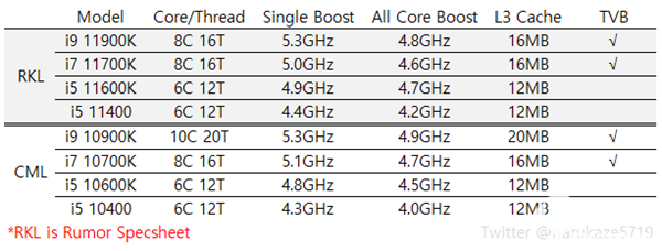 具体来说,酷睿i9-11900K单核最高5.3GHz,全核最高4.8GHz,三缓16MB。对比之下全核睿频比10900K少了100MHz。