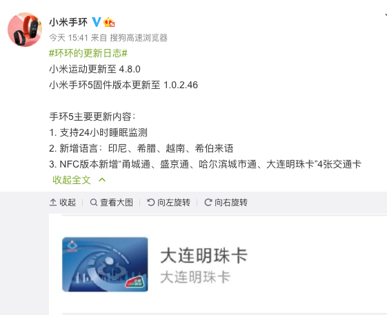 更新后的小米手环5将迟滞24小时睡眠监测、对印尼、希腊、越南、希伯来语的支持以及NFC版本新增的“甬城通、盛京通、哈尔滨城市通、大连明珠卡”4张交通卡。此前小米手环5在睡眠监测方面仅支持午休小憩以及夜晚睡眠,此次增加24小时睡眠监测后将对用户监控自身健康数值有着质的提升。