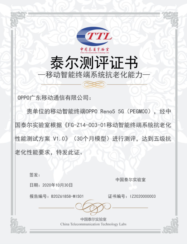 智能手机在进入到5G时代后,软件优化与AI因素的介入,其实让软件因素对流畅性有了更显著的影响。OPPO Reno5系列就是具有代表性的手机新品,其通过多种技术手段进行全面系统级优化,使手机即便在长久使用后也能确保足够的流畅性。据泰尔实验室的报告显示,OPPO Reno5与OPPO Reno5 Pro在应用冷启动、应用热启动、应用安装时间、相机性能、开机时间的表现上,具备五级系统抗老化能力要求。并为其颁发了“泰尔测评证书-移动智能终端系统抗老化能力”。