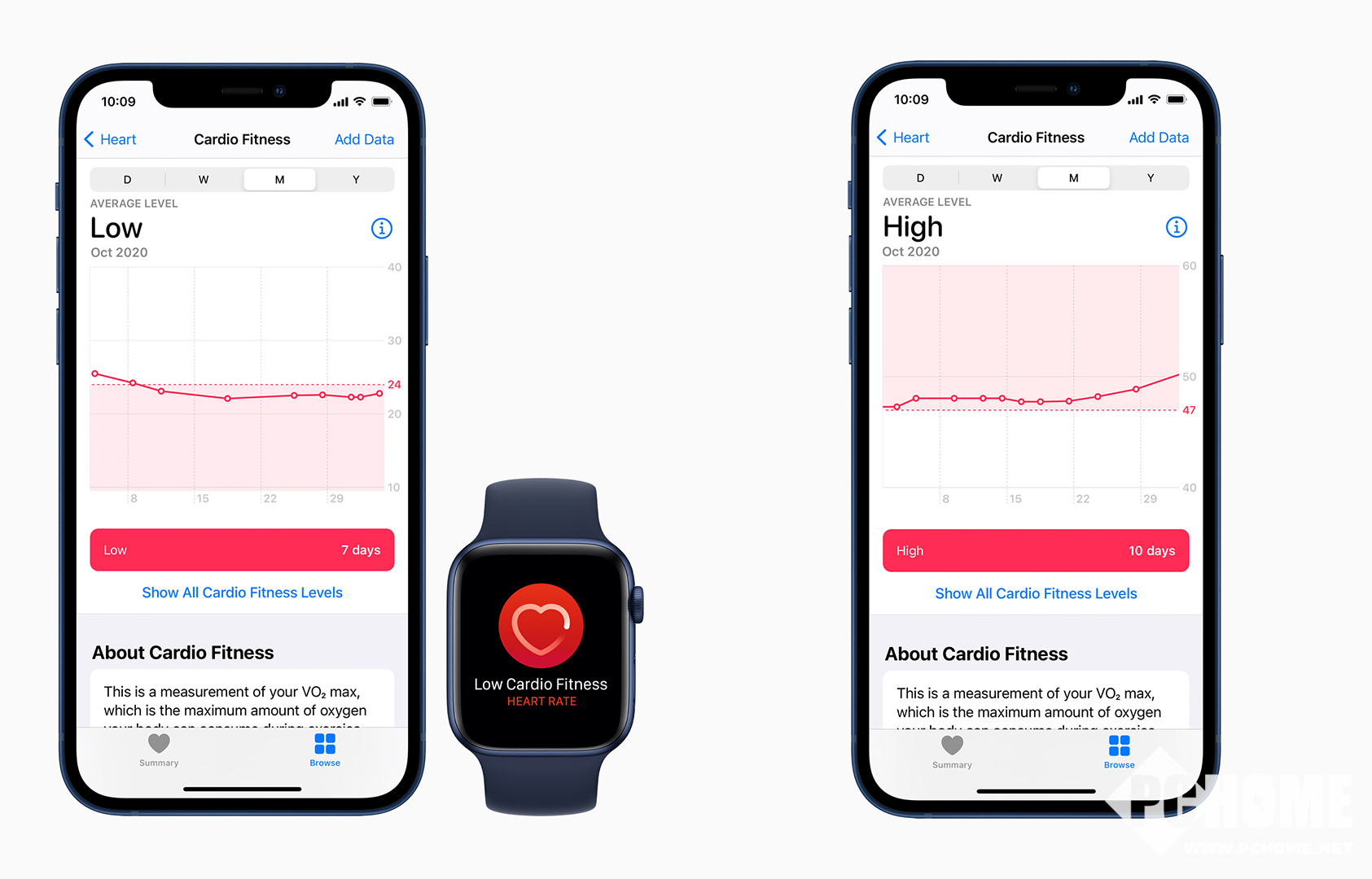 今天的 iOS 14.3 和 watchOS 7.2 让 Apple Watch 用户可以在 iPhone 上的健康 app 中访问“有氧适能”类别,查看他们的有氧适能水平相比他们同年龄段和同性别用户的分类是偏高、超过平均水平、低于平均水平,还是偏低;数据依据来自 Fitness Registry and Importance of Exercise National Database (FRIEND)。用户可以看到他们的有氧适能水平如何在过去的一周、一个月或一年中随着时间而变化。如果一个用户的有氧适能水平降至偏低水平,他们会在 Apple Watch 上收到通知,以及如何随着时间推移而改善的指导,还有及时咨询医生的建议。