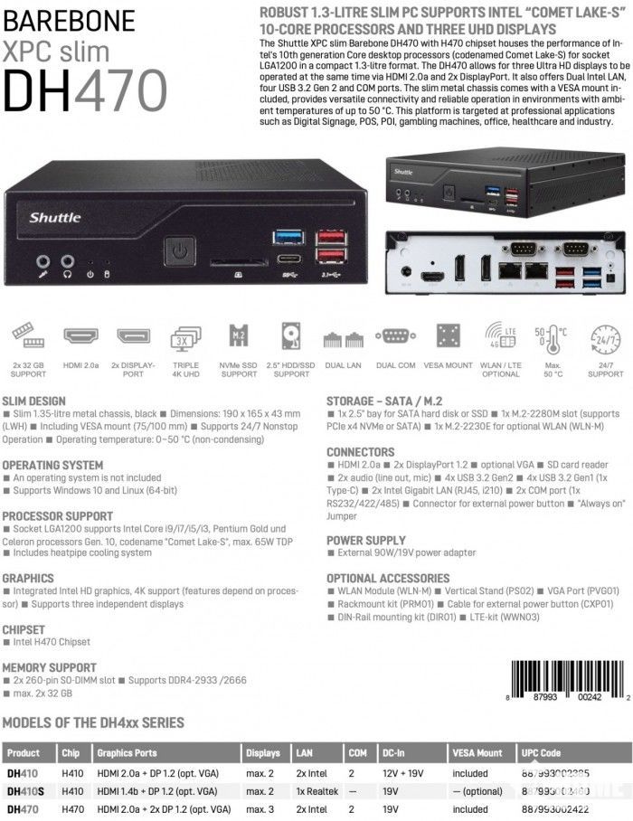 处理器方面,XPC Barebone DH470 迷你 PC 支持入门级的 3.4GHz 双核 G5900、到高端的 2.8GHz 十核 / 20 线程 i9-10900 。存储方面,客户可选 4GB 到最多 64GB DDR4(两条 SO-DIMM 插槽)。
