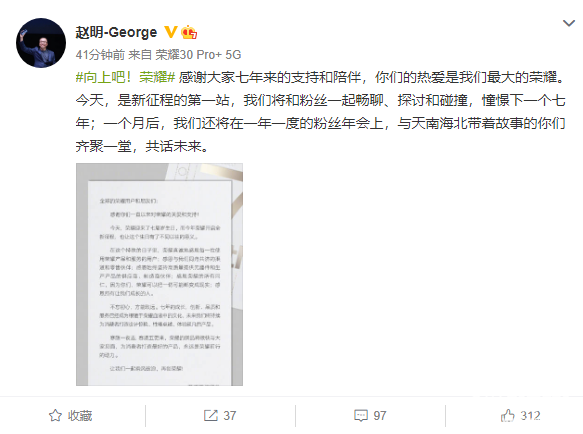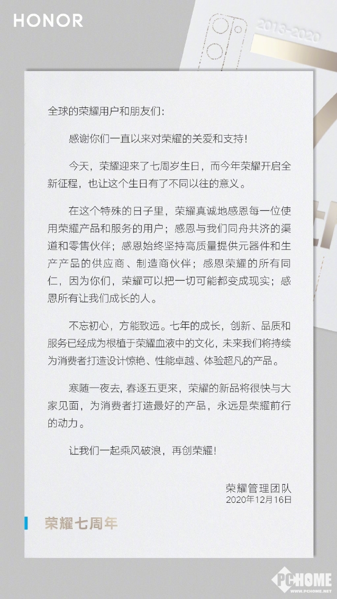 信中,荣耀管理团队表示,今天,荣耀迎来了七周岁生日,而今年荣耀开启全新征程,也让这个生日有了不同以往的意义。赵明还在信中感谢了用户、渠道商、零售伙伴、供应商和制造商伙伴。他透露,在一个月后一年一度的粉丝年会上,荣耀管理团队还会与粉丝们一起共话未来。