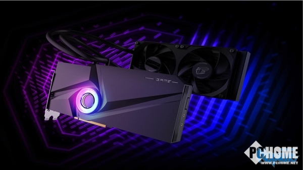 一体式水冷方案采用了“鳃纱”密集水道设计,精密纱片结构增大水冷液与GPU热源的基础面积,外部则搭配两个120mm定制流体长浆扇叶风扇组成的240mm冷排,背部则有族徽金属背板。