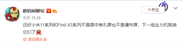 今天,@数码闲聊站爆料称,小米11系列和Find X3系列不是居中单孔屏也不是瀑布屏。