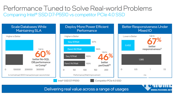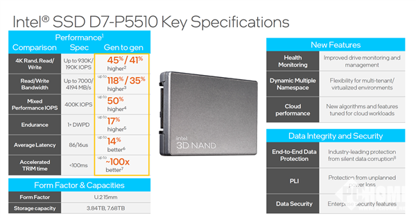 回到产品层面,SSD D7-P5510主要针对云存储应用,采用15m 2.5英寸U.2形态,容量3.84TB、7.68TB,持续读写性能最高7000MB/s、4194MB/s,比上代(D7-P4510)提升118%、35%,4K随机读写性能最高930K IOPS、190K IOPS,比上代提升45%、41%,混合随机读写性能400K IOPS,比上代提升50%,读写延迟86us、16us,比上代提升14%。