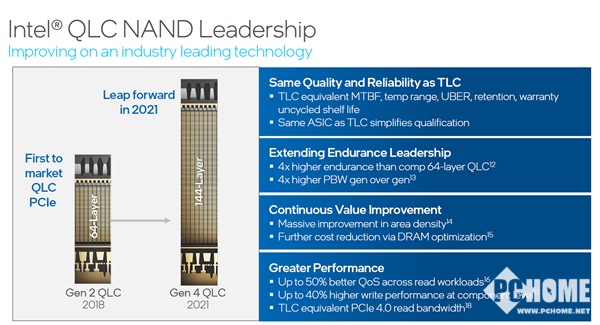 最新的144层堆叠对比两年前的64层堆叠,可靠性、最大写入量已经提升4倍,读取负载QoS提升最多50%,底层写入性能提升最多40%。