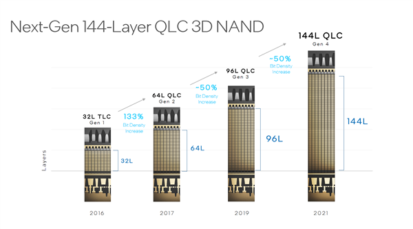 2016年,Intel推出了第一代32层堆叠TLC闪存,次年翻番到64层并进化为TLC颗粒,存储密度提高了133%,2019年来到96层,存储密度提高约50%,而如今的144层再次将存储密度提高了约50%。