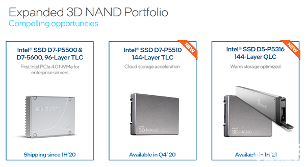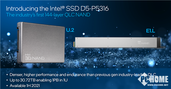 在2020内存存储日活动上,英特尔公布了六款全新内存、存储产品。其中面向数据中心市场的SSD D7-P5510、SSD D5-P5316,还有全球首发144层堆叠的QLC NAND闪存,支持PCIe 4.0。