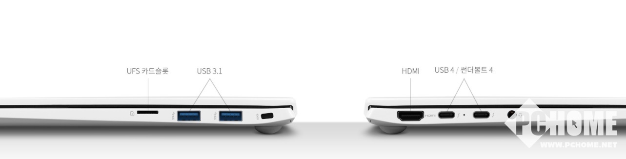 接口方面,LG Gram 16 有两个 USB 3.1 接口,两个 USB4 / 雷电 4 接口,还有 HDMI 和 UFS(Micro SD)接口。