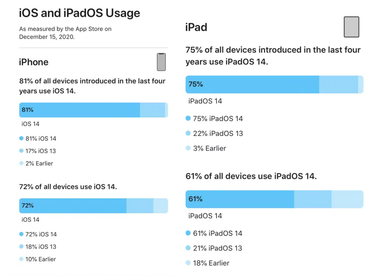 值得注意的是,在今年十月公布的统计数据中,iOS 14的升级率已升至50%,与近日的苹果官方数据相比较,不到三个月的时间,升级率就以攀升至72%。