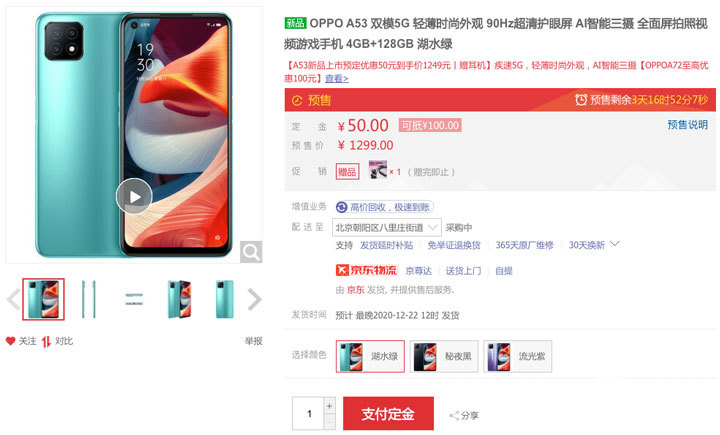 OPPO A53 4+128GB版本售1299元,6+128GB版本售1599元。目前,4+128GB版本已在在欢太商城和各大电商平台全面开启预约,12月21日正式开售,6+128GB版本则计划于12月25日线上线下同步开售。用户在电商平台预购可享定金50元抵100元,首销当天立减50元,最低1249元即可到手,还可获赠兰士顿M305耳机,好评可返现20元。