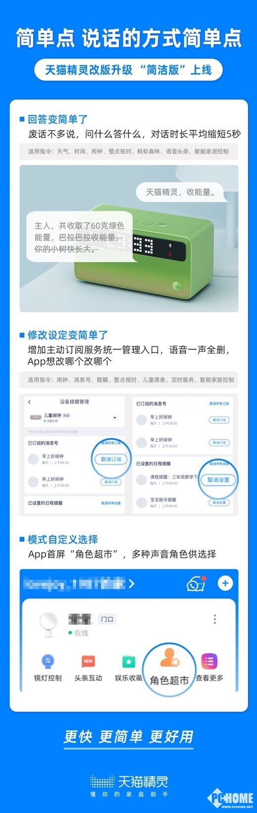 据介绍,即日起天猫精灵将向所有用户全面推送新版本。在“简洁版”上线后,用户在使用天猫精灵查询天气、时间,收蚂蚁森林能量、收听新闻,控制智能家电时,将能够得到简单直接的回复,平均时长可以缩短5秒,效率得到大大的提升。同时,对于喜爱和天猫精灵“闲聊”的用户,也可以在App首页“角色超市”中选择“可爱小萌妹”、“超萌娃娃音“、“精致小鲜肉”等不同的声音角色,将可以听到不同的声音和更丰富的回答语句。