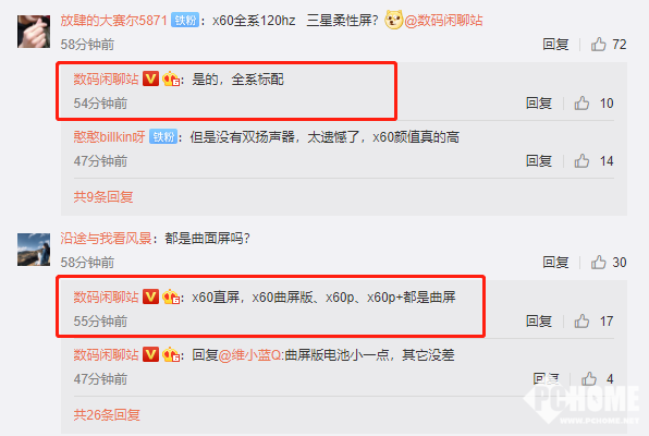 值得注意的是,该博主还在微博评论区透露,X60标准版将会有直面屏和曲面屏两种不同屏幕,曲面屏版除了电池小以外其他没有区别,而X60 Pro和X60 Pro+均是曲面屏,同时X60全系标配120Hz三星E3 OLED屏幕。
