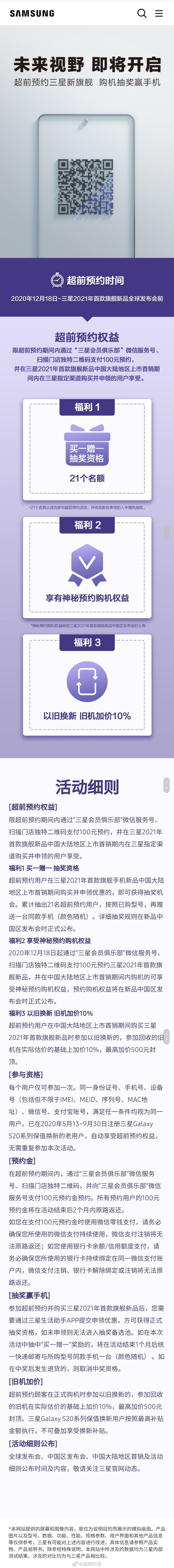 官网信息显示,用户可以通过三星会员俱乐部微信服务号扫描门店二维码支付100元预约,即可享受三星2021年首款旗舰新品在中国大陆地区上市的首发特权,同时会获得专属权益。