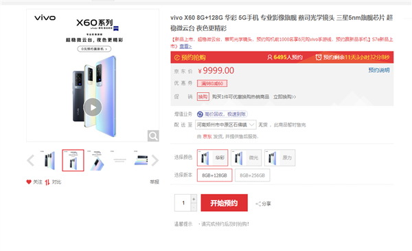 目前vivo X60系列已在官网及合作电商平台上架并接受预约,从预约界面了解到,该机型号为V2046A,预约截止时间为12月29日19时,据猜测,vivo或将于同一天正式发布X60系列。