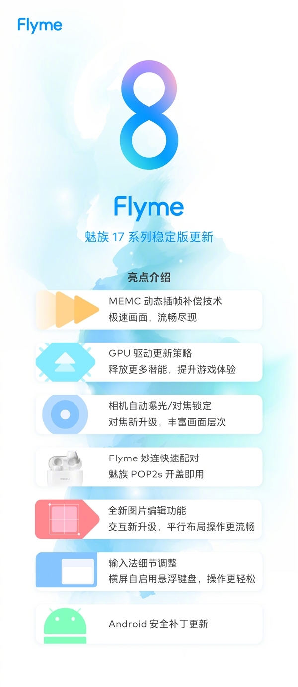 此次更新新增MEMC动态补偿技术/GPU驱动更新策略/全面提升输入法功能/“Flyme妙连”快速配对/相机自动曝光-对焦锁定/全新图片编辑功能,进一步优化了用户的使用体验。