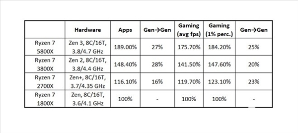 简单来说,每一代的Zen,都实现了相邻代际上游戏、一般计算负载性能20%左右的增加。如果拿锐龙7 5800X和锐龙7 1800X相比,APP运行性能提高了89%、游戏性能提高了84%。