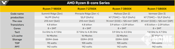 日前,Golem做了一次有趣的评测,一口气找来四代锐龙,包括Ryzen 7 1800X, Ryzen 7 2700X, Ryzen 7 3800X和Ryzen 7 5800X考察性能的变化,注意,它们都是8核16线程处理器,很具有代表意义。