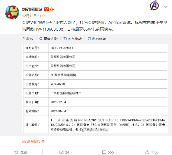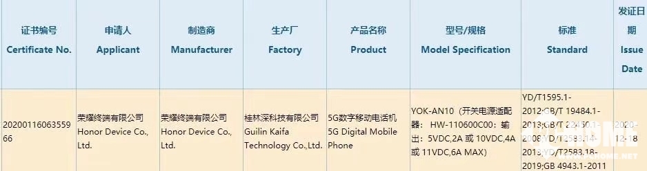 荣耀V40系列离正式发布不远了,最近它的情报也是频频曝出。本月早些时候,荣耀V40系列通过工信部认证,而日前,该机又通过了3C认证。