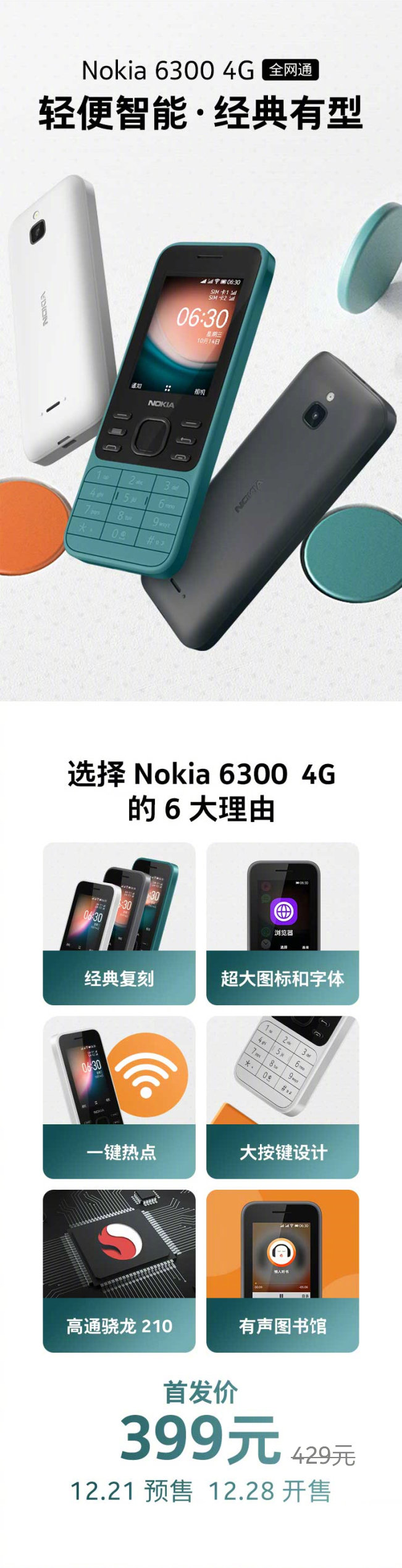 日前,诺基亚6300 4G正式开启预售,售价429元,提供黑色、蓝绿色、白色三种配色。值得一提的是,这是一部外观复刻2007年诺基亚6300的功能机,基于骁龙210打造。