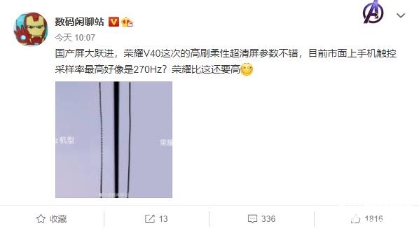 荣耀V40系列将于近日正式发布,今天上午@数码闲聊站 在微博曝光了荣耀V40 的屏幕测试谍照,透露该机屏幕触控采样率超过270Hz。
