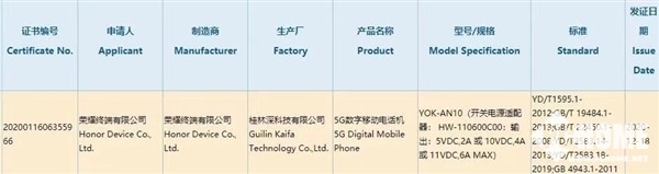 根据近期曝光的消息来看,荣耀 V40(YOK-AN10)在月初时就已通过了工信部认证,挂名荣耀终端,同时3C认证信息显示,该机将配备一款66W快充电源适配器,并支持45W无线快充。