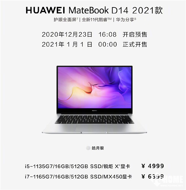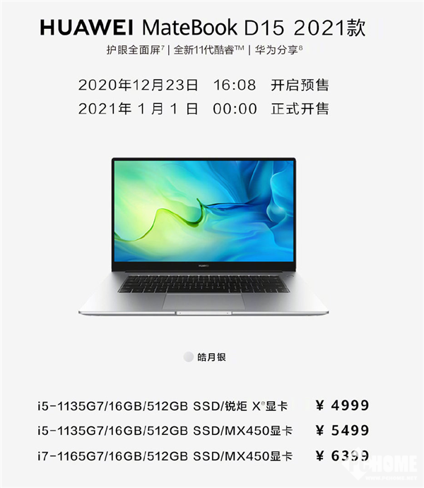 MateBook D15 2021笔记本的酷睿i5+16GB+512GB+Xe核显版售价4999元,酷睿i7+16GB+512GB+MX450独显版售价5499元,酷睿i7+16GB+512GB+MX450独显版售价6399元,12月23日两款新品预售,2021年1月1日正式开卖。