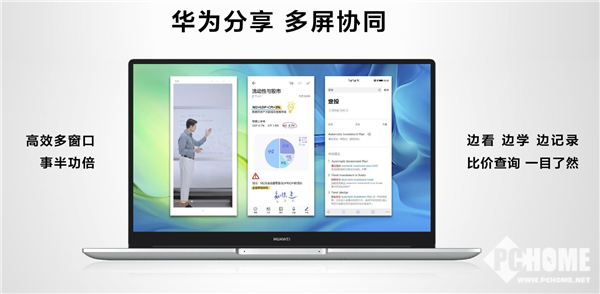 此外,MateBook D14/D15 2021笔记本的多屏协同功能也升级了,这一次可以同时在PC中打开3个手机窗口,带来了更强大的多屏协同能力。