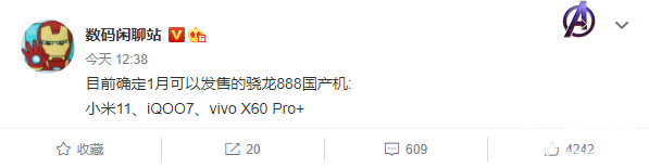 据爆料博主@数码闲聊站透露,除了目前已定档12月28日发布的小米11系列之外,下个月还有iQOO7、vivo X60 Pro+两台搭载骁龙888处理器的国产机将会发售。