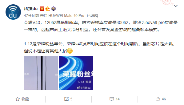 荣耀V40系列将于近期正式发布,但是具体日期却一直没有公布。今天,微博博主@科技du 爆料称荣耀V40将于1月13日的荣耀粉丝年会前后发布。