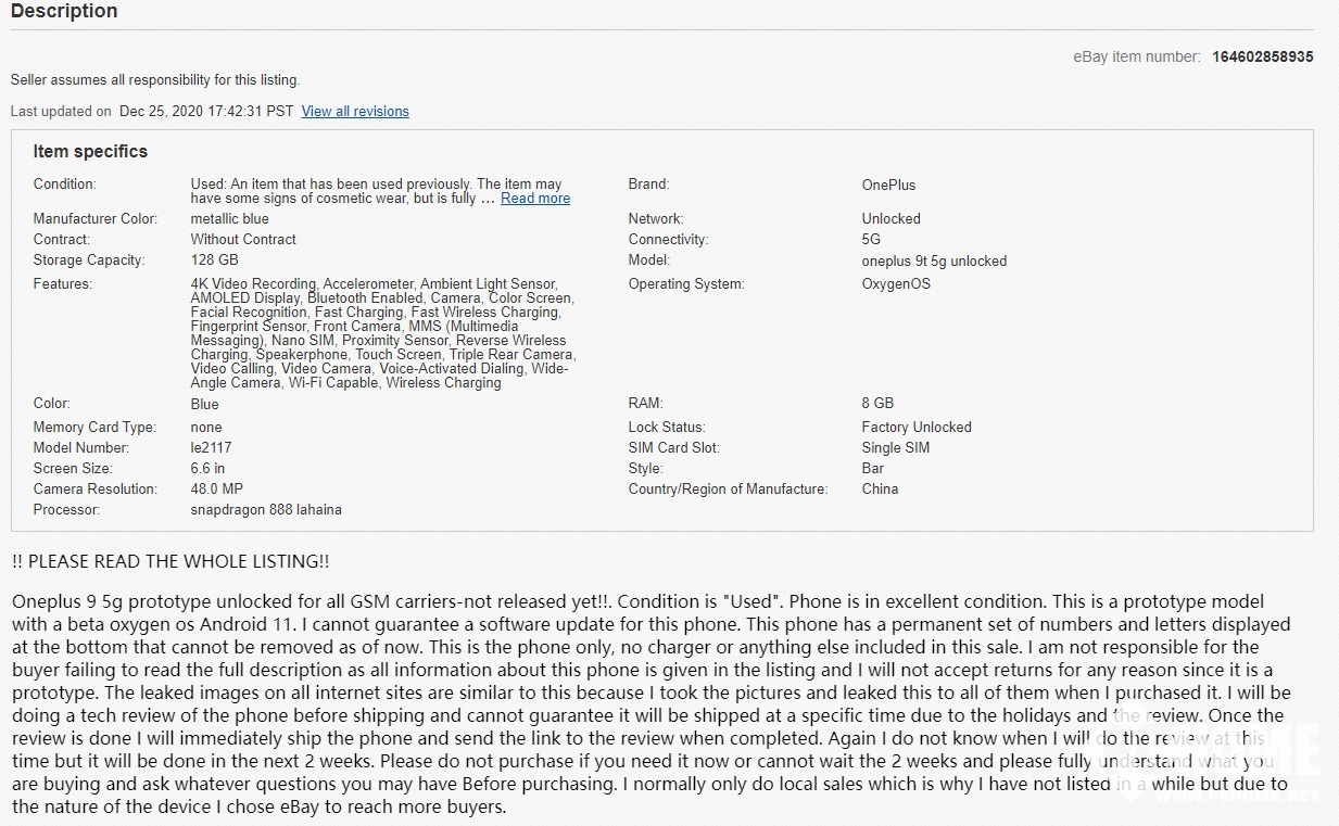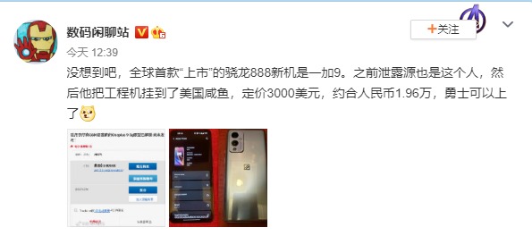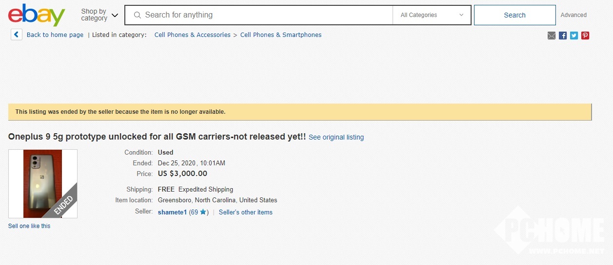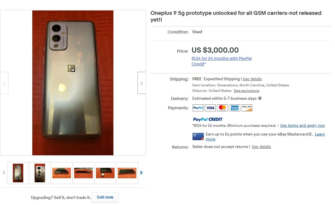 据@数码闲聊站表示,有一名爆料者将他手中的一加 9 5G工程机挂到了eBay上,定价3000美元(约19622元人民币)。目前该平台已将其下架。
