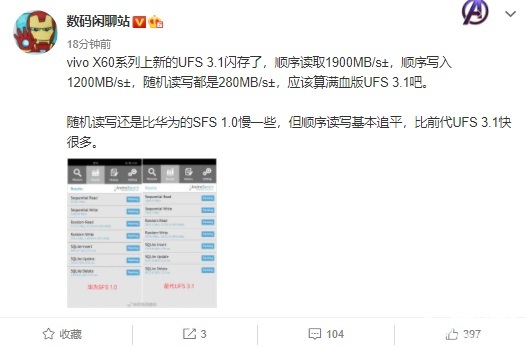 数码博主 @数码闲聊站 爆料称,vivo X60 系列采用了最新的 UFS 3.1 闪存,该机顺序读取速度可达 1900MB/s 左右,顺序写入可达 1200MB/s 左右,随机读写速度可达 280MB/s 左右。
