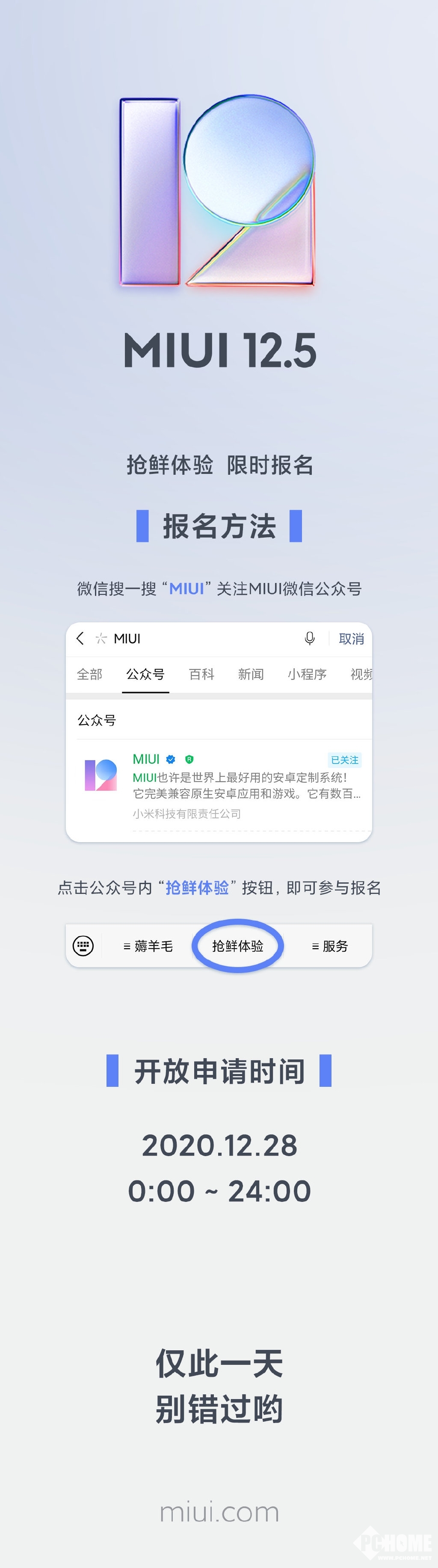 1、微信搜索关注【MIUI】,关注MIUI微信公众号,点击下方“抢鲜体验”参与报名;