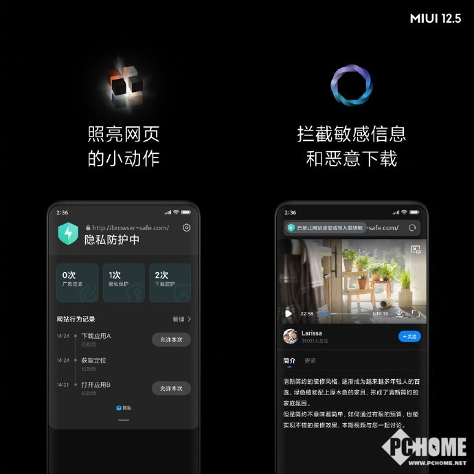 MIUI12.5浏览器升级隐私保护能力,网页行为记录,照亮网页的小动作。自动拦截网页获取敏感信息,拦截网页恶意下载。同时加入上网防追踪,你的行为只有你知道。