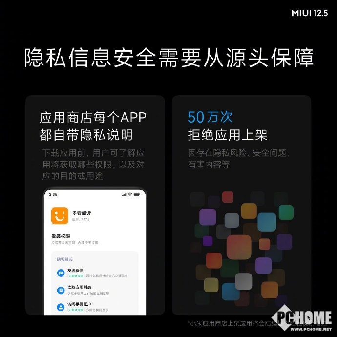 隐私信息安全需要从源头保障,MIUI12.5中,小米应用商店每个App都将自带隐私说明,存在隐私风险、安全问题、有害内容的拒绝上架。