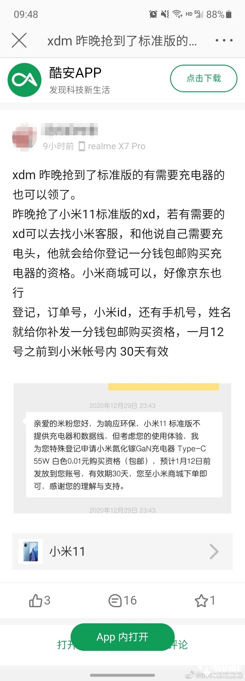 有酷安网友爆料称,尽管抢到的是小米11标准版,但与客服沟通后可登记一分钱包邮购买充电器+数据线的购买资格,30天内有效,小米方面解释是为了保障用户的使用体验。