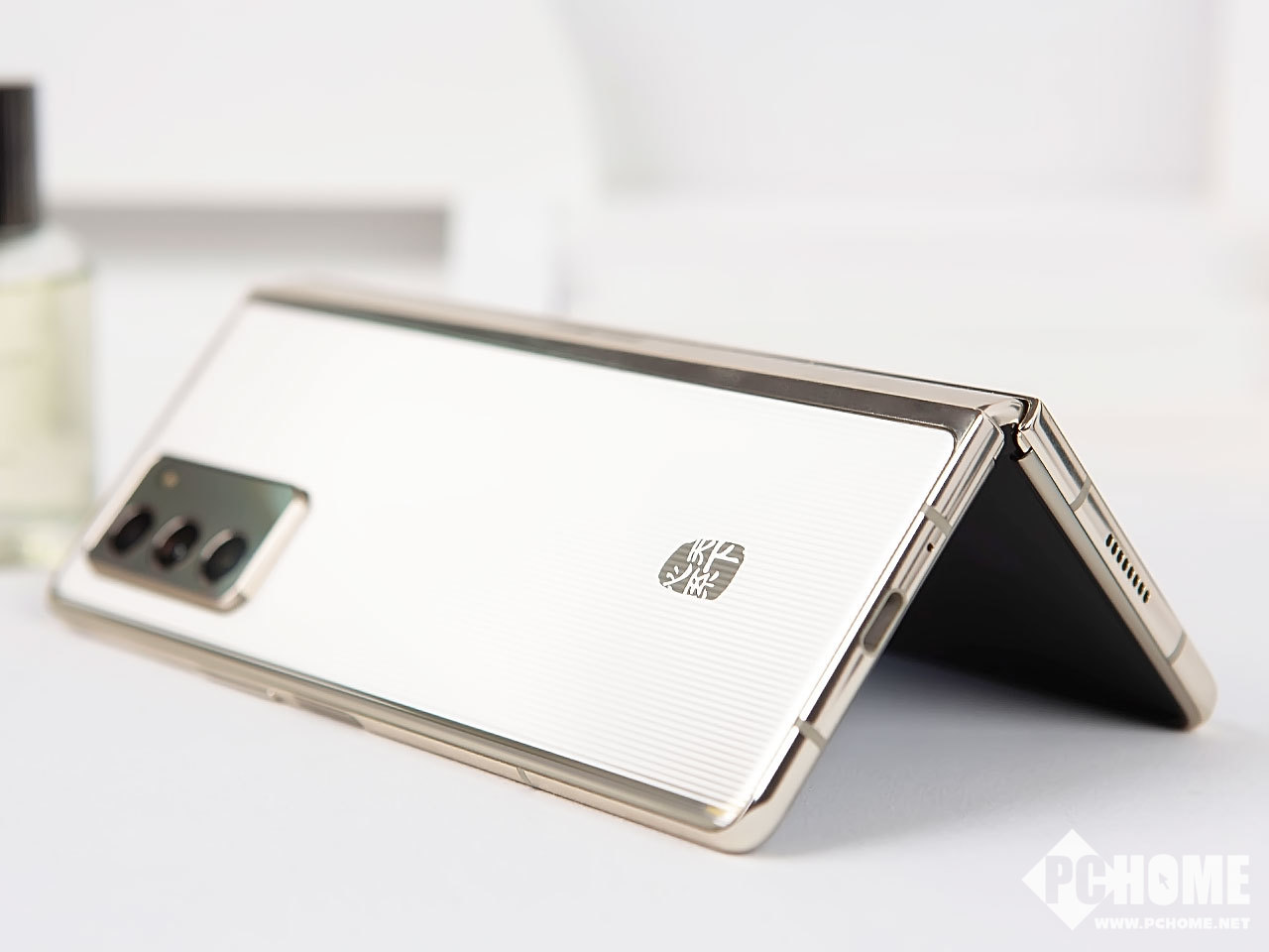 三星W21 5G造型硬朗大气,大胆采用了金色外观配色,背板玻璃上刻有纤细的一排排线条,在灯光下能够产生一定的光线色散效果,触感细腻柔滑。底部还装点有“心系天下”logo,显得十分尊贵大气。机身中框、按键以及铰链均为金色,保证手机整体配色统一,看上去十分精致。