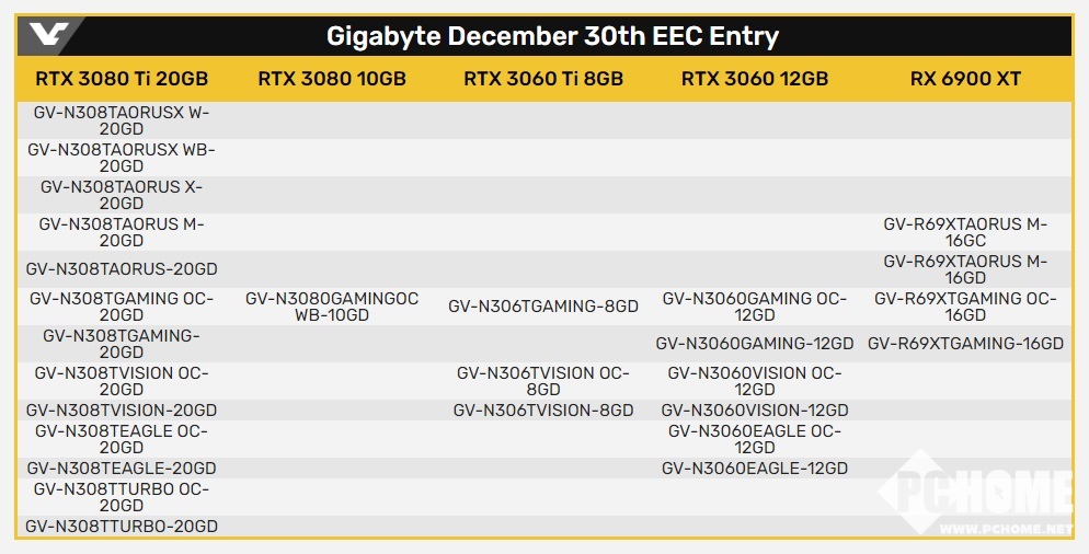 外媒制作了ECC公开的技嘉新显卡信息。根据表中数据,技嘉即将推出的3080 Ti显卡型号最多,除此之外还有6款3060显卡,将搭载12GB显存,反而比3060Ti的8GB显存更大。