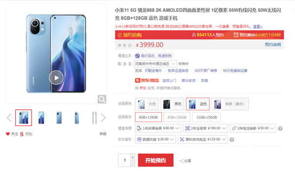 小米11将于2021年1月1日零点在全渠道开启首销,售价3999元起。截至发稿前,小米京东自营旗舰店,小米11的预约人数已超85万人,可谓小米年度爆款。